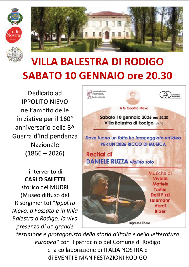 Omaggio a Ippolito Nievo sabato 10 gennaio alle ore 20.30: recital di violino đ” e storia a Villa Balestra di Rodigo