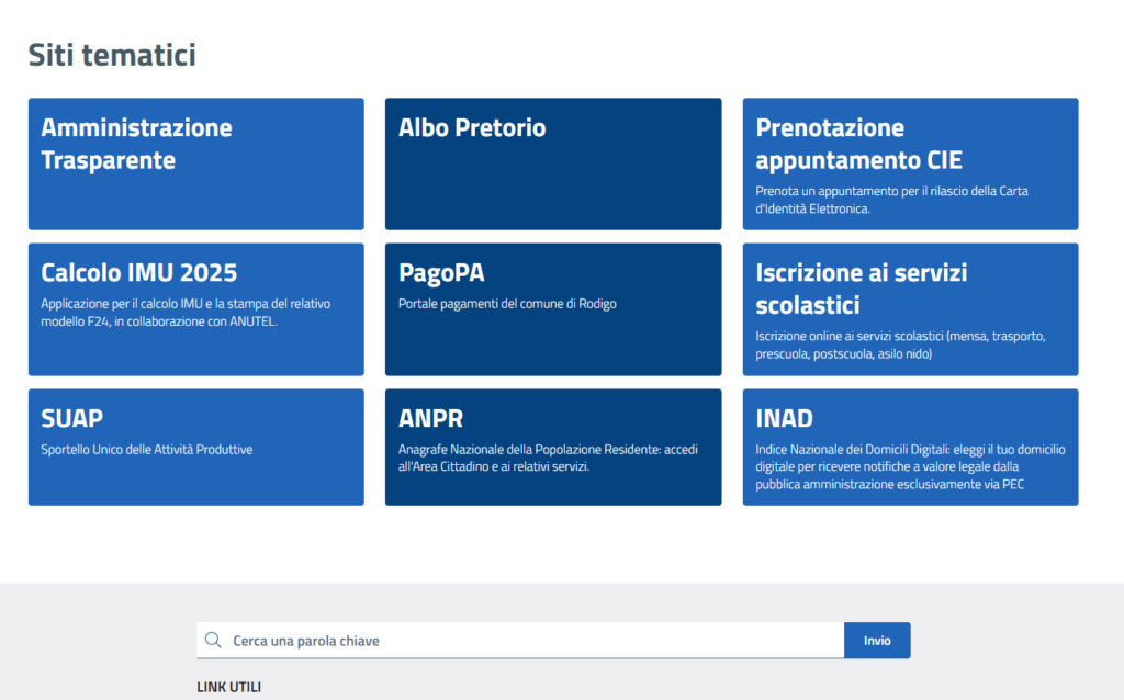 oppure, scorrendo la Home page del sito internet del Comune di Rodigo, selezionare la casella blu con la dicitura "PRENOTAZIONE APPUNTAMENTO CIE", (vedi foto sotto) e in seguito: