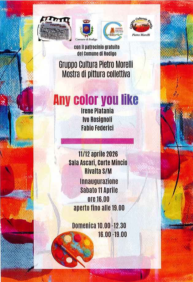 “Any color you like” è la mostra di pittura collettiva del Gruppo Cultura Pietro Morelli, con opere di Irene Platania, Ivo Rosignoli e Fabio Federici.