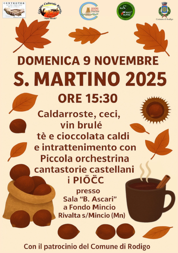 .Domenica 9 novembre un pomeriggio di festa per S. Martino a Fondo Mincio, con musica, caldarroste 🌰e bevande calde, all'insegna della tradizione e dell'allegria🍂.