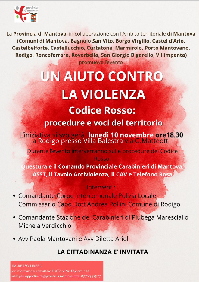 👉 L’iniziativa “Un aiuto contro la violenza – Codice Rosso Procedura e voci del territorio” si terrà a Rodigo lunedì 10 novembre, alle 18.30, nei locali di Villa Balestra - p.zza Balestra n.1 (ingresso con auto da via Rampina)